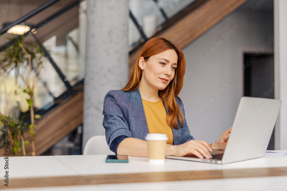 Portrait of focused businesswoman sitting at corporate office and working data analyzes on a laptop.