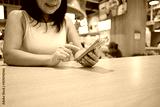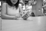 Close up of woman using a mobile phone while sitting at a wooden table in a restaurant