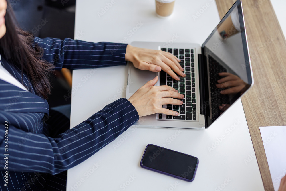 Top view of businesswoman's hands typing on laptop during meeting at office.