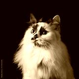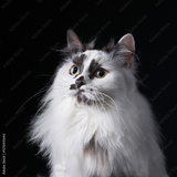 A close-up of a long-haired cat with fluffy white and black fur, captured against a dark background. The soft lighting highlights the feline's whiskers and elegant expression.