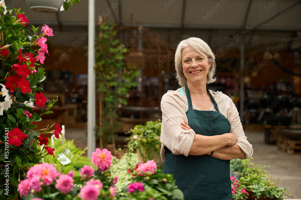 Senior florist smiling with crossed arms in flower shop