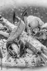 A close-up of gourmet seafood risotto featuring mussels, shrimp, octopus, parmesan, and fresh herbs, showcasing vibrant colors and delicate textures