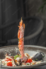 A gourmet seafood risotto elegantly presented with a vertical skewer of shrimp, surrounded by mussels, octopus, tomatoes, and parmesan on a dark plate