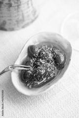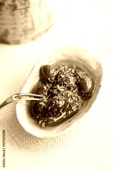 Marinated kalamata olives with herbs and olive oil in ceramic bowl