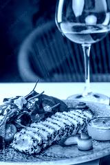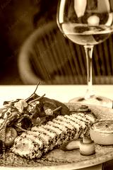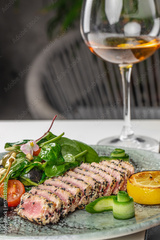A gourmet dish of sesame-crusted seared tuna served with a fresh spinach and olive salad, cherry tomatoes, pine nuts, cucumber, grilled lemon, and a glass of white wine