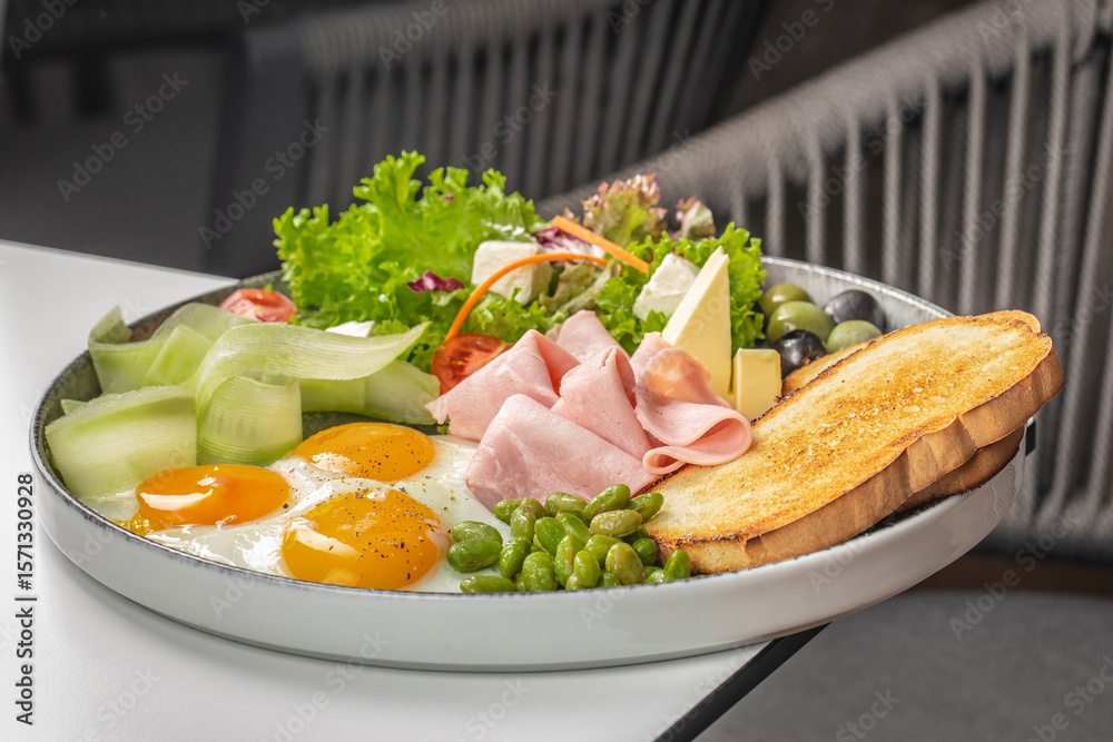 A colorful and balanced breakfast platter featuring sunny-side-up eggs, ham, cheese, fresh vegetables, olives, edamame, and toasted bread, beautifully arranged on a round plate