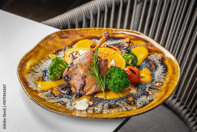 A succulent roasted duck leg is beautifully presented with vibrant vegetables, fresh orange slices, and a rich berry sauce on a rustic ceramic plate