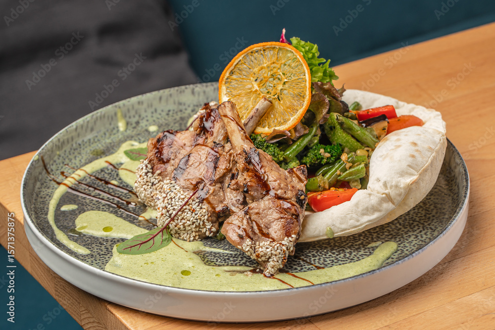 Grilled lamb chops with a sesame crust served on a bed of creamy herb sauce, accompanied by fresh pita bread, sauteed vegetables, and a slice of dried orange for garnish