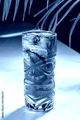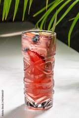 A vibrant red cocktail served in a decorative tiki glass, garnished with fresh strawberries, blueberries, and a green leaf for a tropical and refreshing presentation