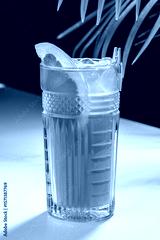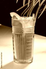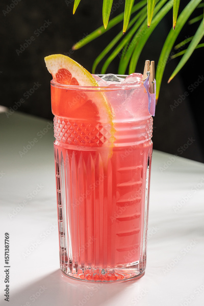 A refreshing pink cocktail served in a tall textured glass with ice cubes, garnished with a grapefruit slice and a delicate flower petal clipped to the rim, exuding a tropical and vibrant feel
