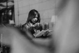Young professional focused on writing in her notebook outdoors, conveying creativity and concentration.