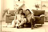 Cheerful parents and son sit on the floor of home, holding a symbolic house roof over heads. This represents safety and protection in new home, celebrating family security and real estate.