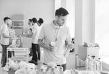 Portrait of young man volunteer sorting donations of foodstuffs in cardboard boxes for charity food drive. People volunteering in food bank working in charitable foundation together.