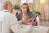 Elderly couple spending leisure time together online using a phone at home. Positive and happy moments of internet entertainment, highlighting the connection and joy experienced by seniors.