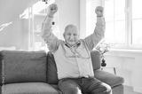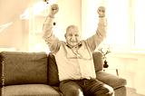 Elderly excited senior man sitting on sofa in living room at home holding hands up in fist like a winner. Happy smiling retired person wearing blue shirt looking at camera with satisfied expression.