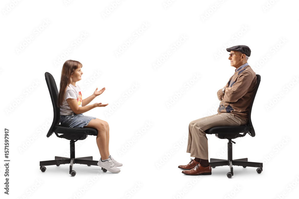 Child sitting in a chair and talking to an elderly man
