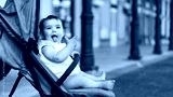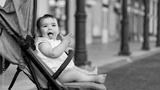 baby pointing at the background and sticking out his tongue with a surprised expression