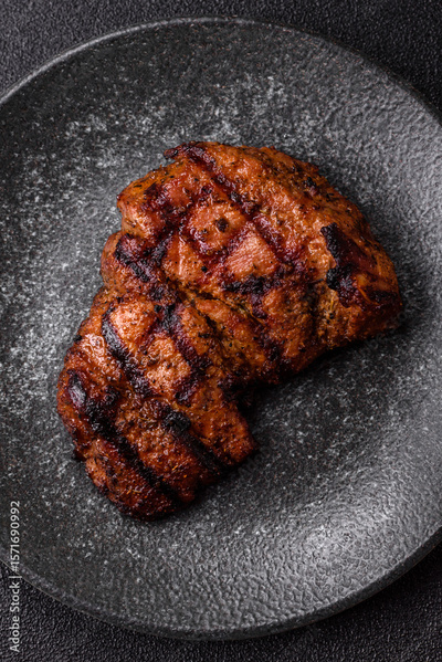 Meat, juicy beef steak grilled cooked to perfection for lunch. Barbecued steak