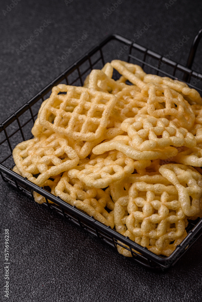 Lattice or wafer potato chips, crispy yellow snacks, takeaway food