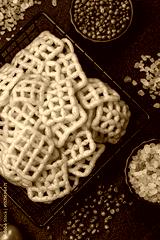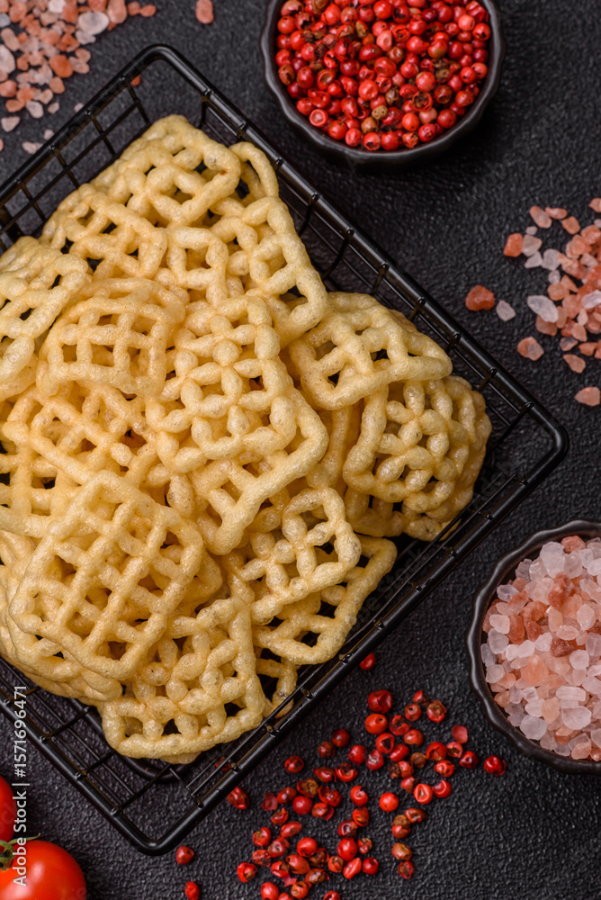 Lattice or wafer potato chips, crispy yellow snacks, takeaway food