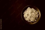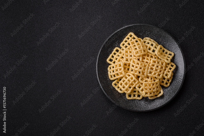 Lattice or wafer potato chips, crispy yellow snacks, takeaway food