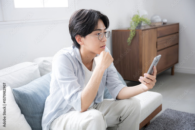 部屋でスマホを見る、持つタップする眼鏡のハンサムな男性のクローズアップ