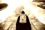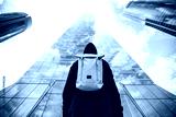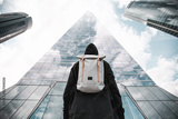 Urban backpacker in the city with background buildings