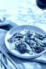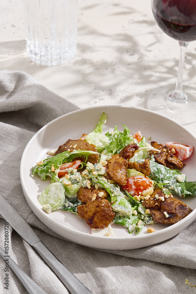 Chicken liver salad with vegetables in bright daylight, minimal overhead composition