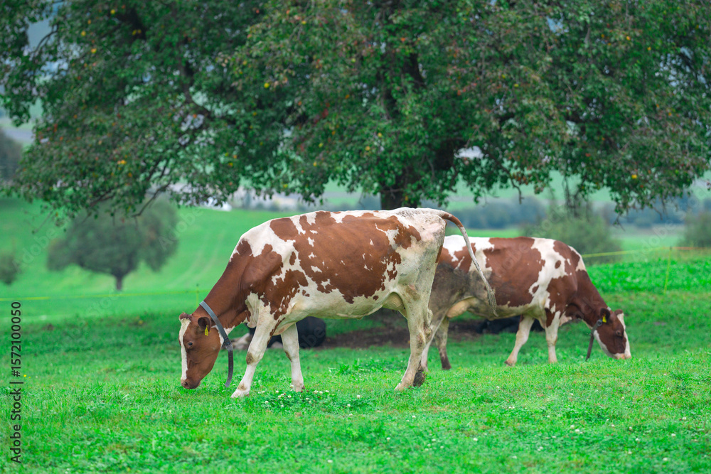 Cows grazing in a green pasture. Herd of cattle in the countryside. Alpine meadows with grazing cows. Farmland with cows livestock. Grassy fields filled with cows. Outdoor scene with grazing bovine.