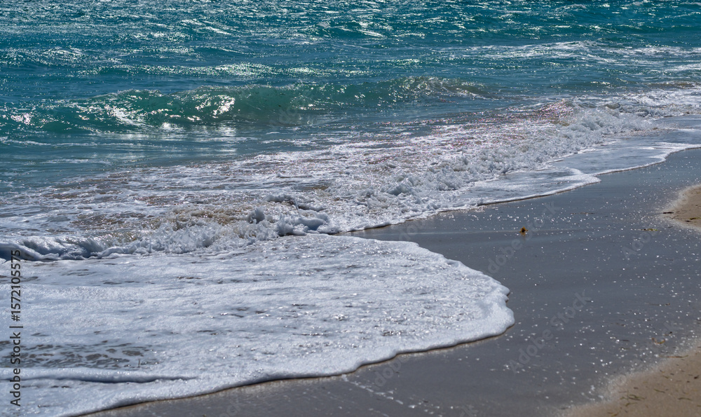 Ocean wave motion on sea shore. Summer sea breeze. Sea nature backdrop. Peaceful ocean. Dreamy ocean horizon. Coastal ocean paradise wallpaper. Seafoam waves. Azure water surface. Golden hour beach.