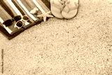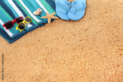 Beach background top border with sunbathing towel flip flops sunglasses and starfish on sand summer couple holiday vacation scene design photo