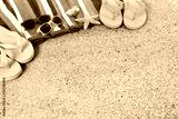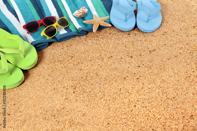 Beach background border with sunbathing towel flip flops sunglasses and starfish on sand summer couple holiday vacation scene design photo