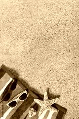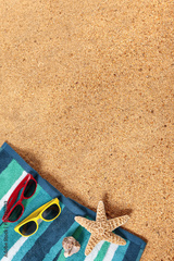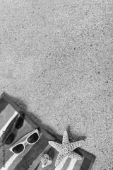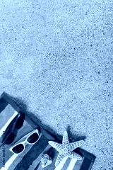Tropical carribean beach background lower border with sunbathing towel sunglasses and starfish on sand summer couple holiday vacation scene design photo