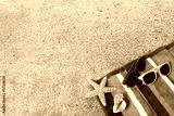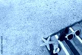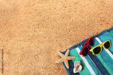 Tropical carribean beach background lower border with sunbathing towel sunglasses and starfish on sand summer couple holiday vacation scene design photo