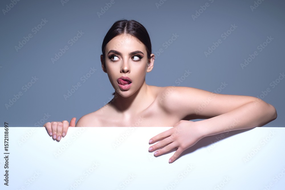 Woman presents with a blank board. Portrait of attractive young woman holding billboard on isolated background. Empty text, copy space. Woman showing blank signboard. Girl behind empty board.