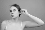 Girl shaping brown eyebrows. Woman eye with beautiful eyebrows. Perfect shaped brow, eyelashes with brow gel brush. Paint eyebrows.