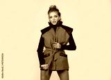 Modern style jacket. Young glamour woman wearing stylish fashion dress. Fashion model in studio.
