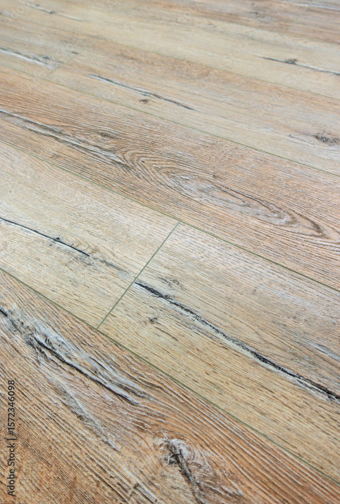 Close-up of distressed light brown wooden floor texture. Rustic wood grain and knots are visible in an angled view. Perfect as a background or surface texture.