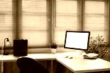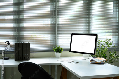 Blank monitor screen, surrounded by plants and natural light from window blinds