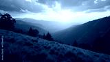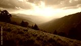 Stunning sunset over mountain range and valley, golden hour landscape photography