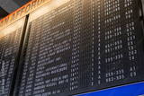 Main hall European airport main hall with black vintage mechanical flight information display board, flight arrivals and departures board European Airport, Germany, Frankfurt - February 6, 2025