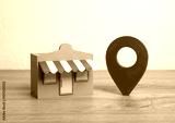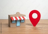 Shop and red geolocation sign. Advertising and presenting your business on maps and social networks. Geotargeting, SEO for businesses, or location-based customer acquisition.