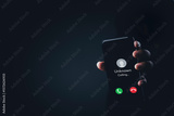 Hand holding mobile phone with unknown caller notification, concept of telephone fraud, call blocking, digital security, unwanted calls, anonymous communication, phishing attempt.