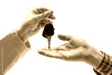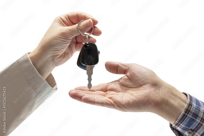 Woman's hand handing over car keys to a man's hand in a checkered shirt on isolated background. Concept of selling or renting a car