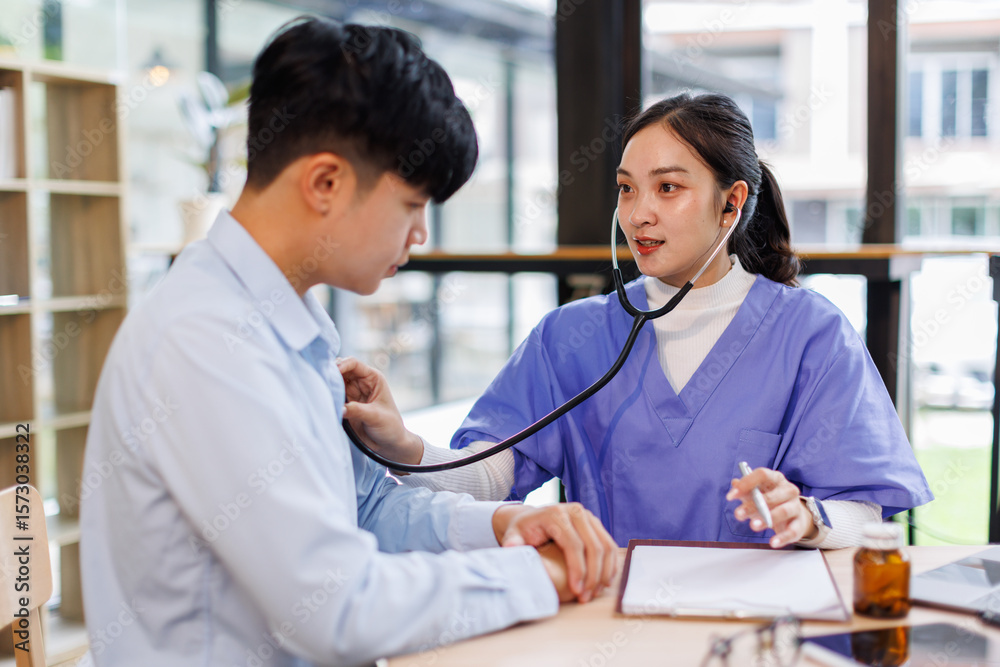 Asian woman nurse use stethoscope, checking up heart beat, lunch of auscultation in doctor office at hospital.Patient worker has to get medical checkup for her health or medical checkup cardiologist.