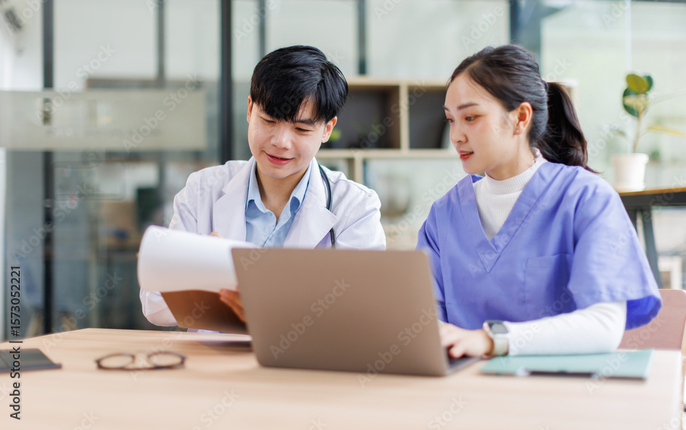 Doctors, nurse or laptop in day healthcare, planning research or surgery teamwork in wellness hospital. Talking, thinking or medical on technology for collaboration help or life insurance app.