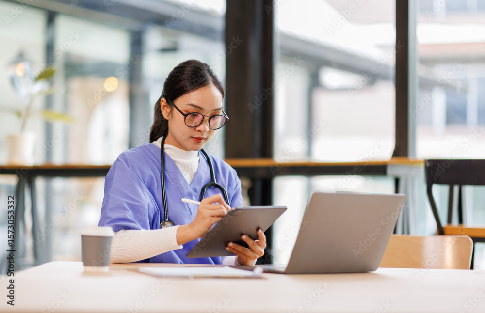 Female medical intern in blue medical scrubs e-learning on laptop computer at the ordination, Doctor and nurse healthcare and medicine.
