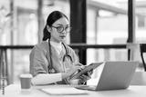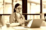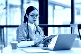 Female medical intern in blue medical scrubs e-learning on laptop computer at the ordination, Doctor and nurse healthcare and medicine.