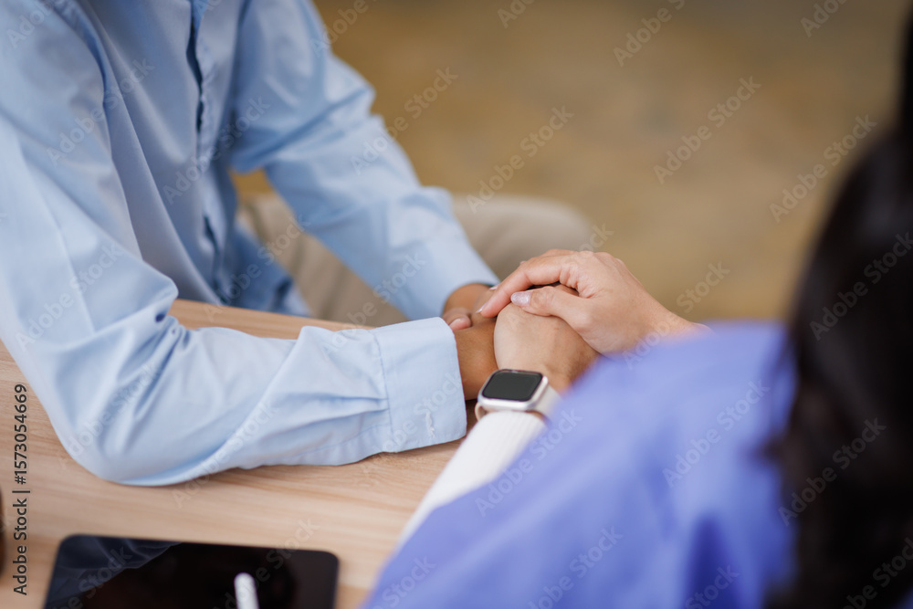 A female nurse hand caregiver holds senior patient's hands, and comfort an elderly. Doctor helping For care senior man and trust in nursing homes