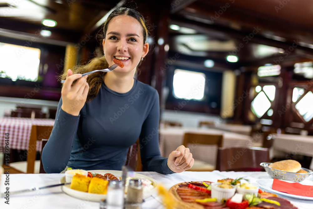 Young Woman Having Breakfast with Eggs, Bacon, and Vegetables